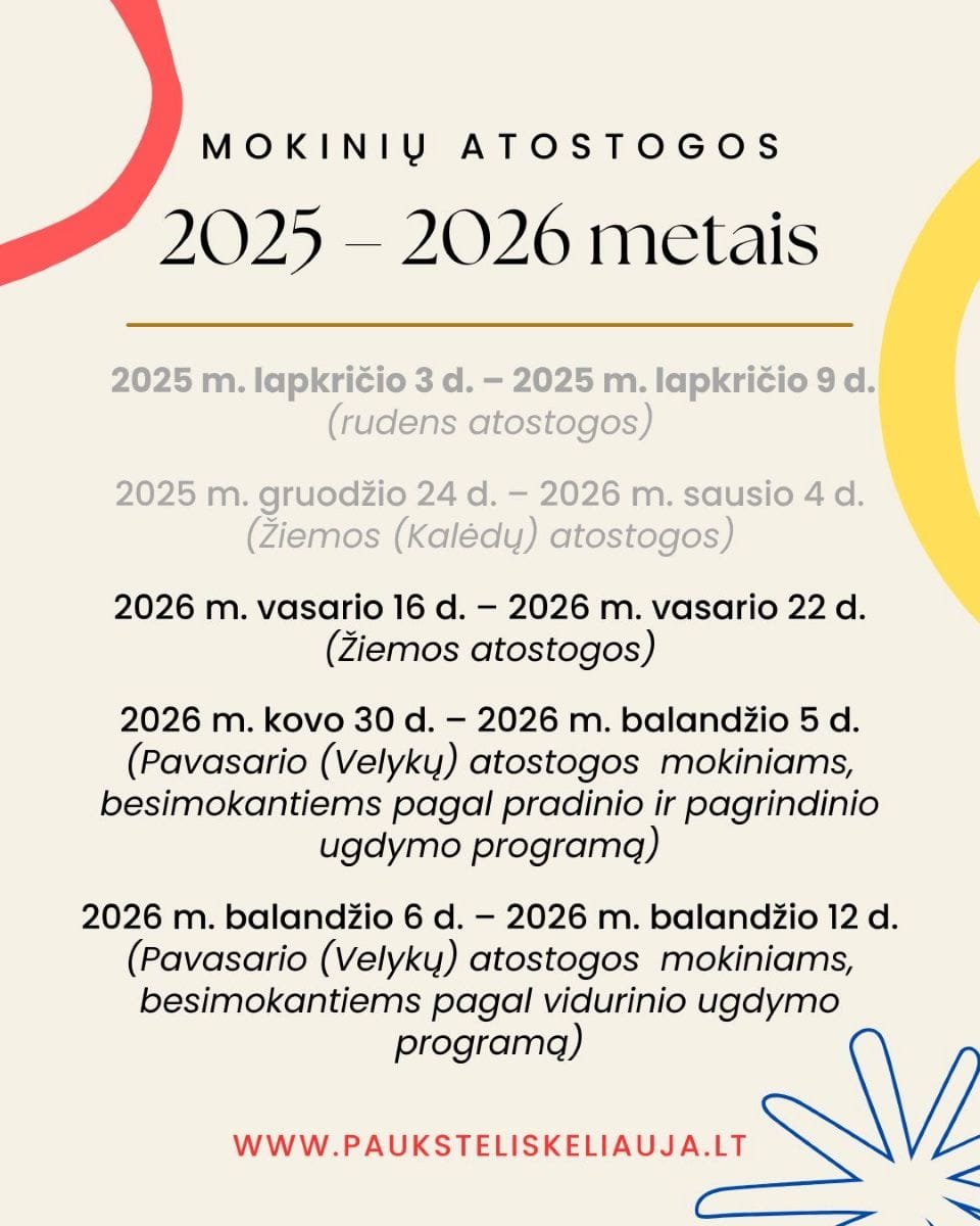 Žiemos atostogos: 2026 m. vasario 16 d. – 2026 m. vasario 22 d.